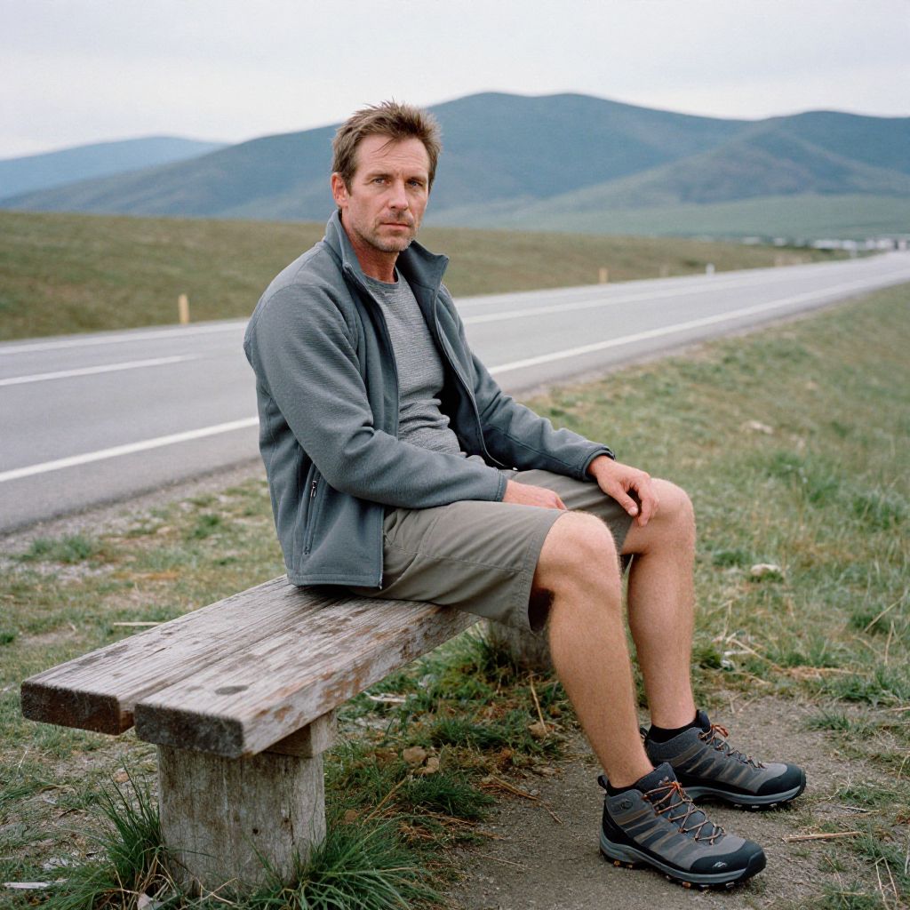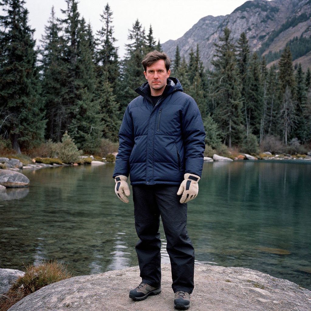 A man, navy down jacket, black ski trousers, thermal base layer, waterproof hiking boots, fleece-lined gloves, dense pine forests, crystal-clear lakes, rugged mountain peaks, anscochrome analog film, focused expression Man has masculine face and piercing eyes