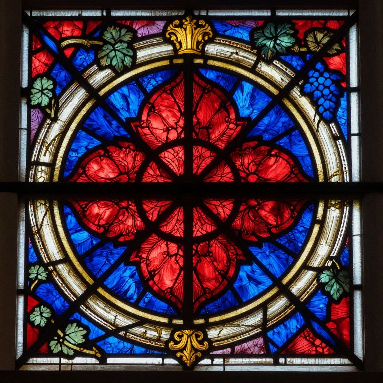 A detail from a staned glass window in the cathedral of Notre Dame in Paris. The decoration features a red and blue pattern surrounded by grape vines.