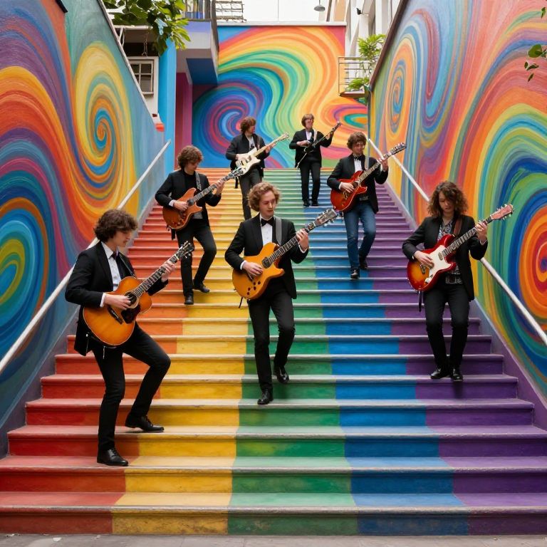 Musicians ascend a vibrant, rainbow-hued staircase where each step defies gravity, transforming into a living canvas of swirling colors and patterns as they play.