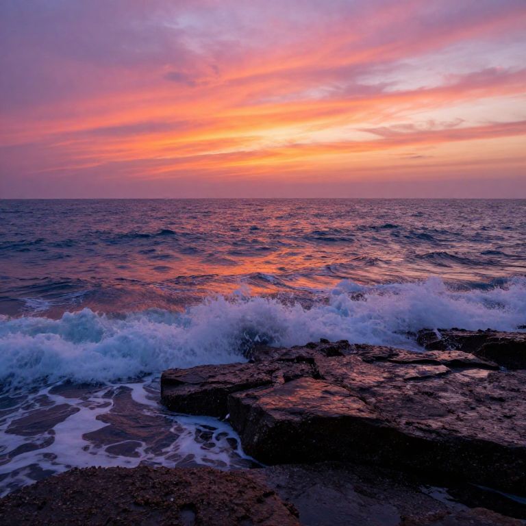 Sunset colorful ocean waves crashing on a rocky shore, vibrant hues of orange, pink, and purple painting the sky, with gentle white foam blending into deep blue water, capturing a serene and dramatic coastal scene in high detail.