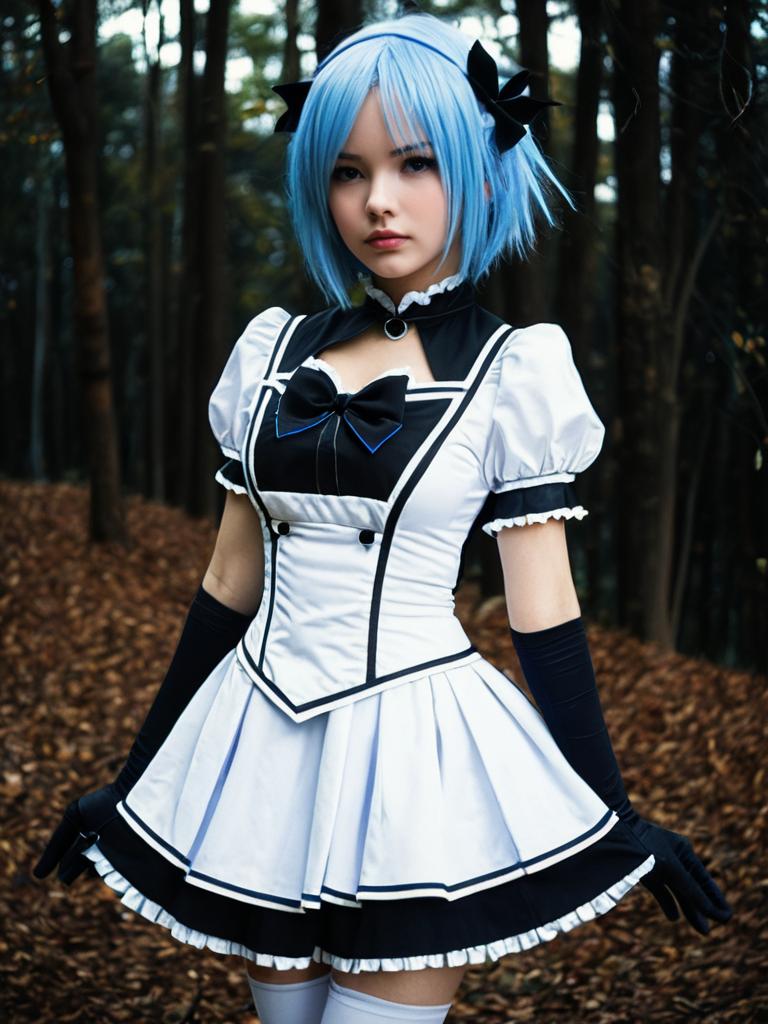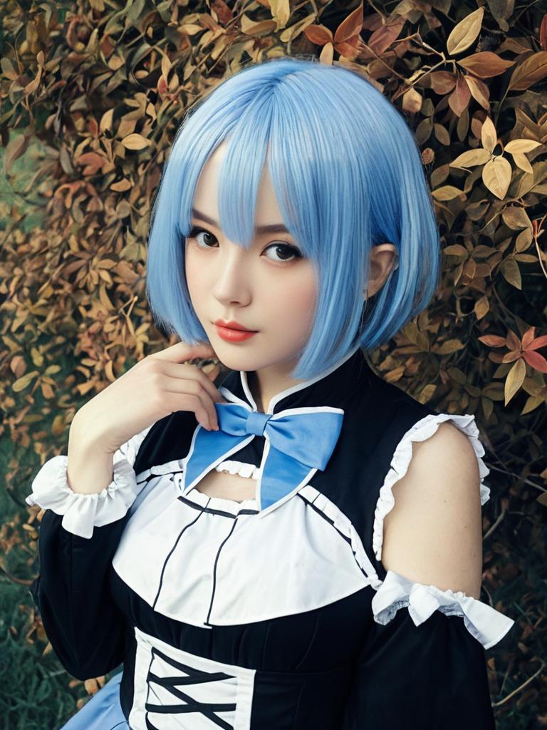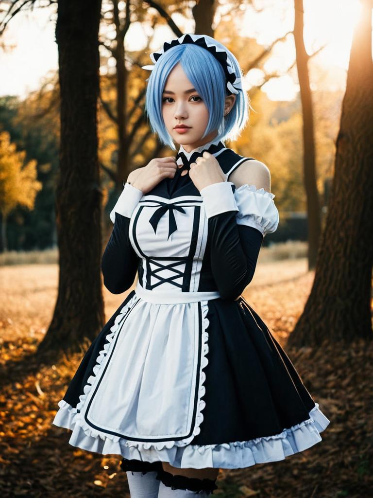 R_E_M, 1girl, (beautiful face:1.25) short blue hair, blue eyes, hair over one eye, hair ornament, pink hair ribbon, rem's maid uniform, detached sleeves, (realistic:1.7), ((best quality)), absurdres, (ultra high res), (photorealistic:1.6), photorealistic, octane render, (hyperrealistic:1.2), (photorealistic face:1.2), (8k), (4k), (Masterpiece), (realistic skin texture), (illustration, cinematic lighting, wallpaper), ( beautiful eyes:1.2), ((((perfect face)))), (cute), (standing), ((looking at viewer)), (dynamic pose:1.3), upper body, standing, indoors, living room, sofa, tables, window