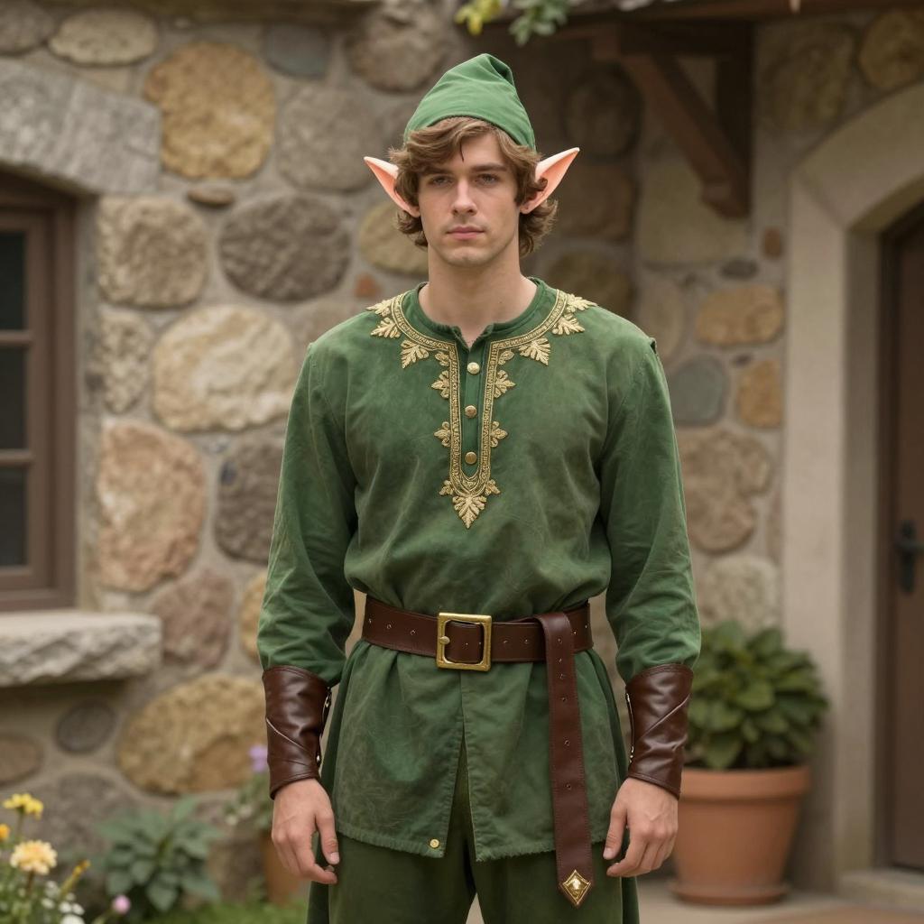 Infant peter pan costume, photograph of a cute toddler boy sitting on grass in a forest, wearing a green tunic with brown buttons, brown belt, brown foot wraps, light brown shirt, short brown hair, blue eyes, serious expression, wooden fence in background, natural light, green grass, small white flowers, daytime, realistic style, slight focus on toddler, slightly blurry background