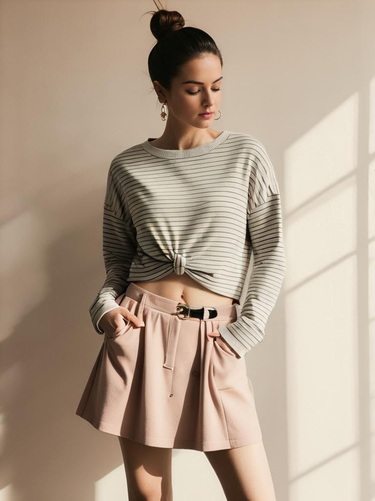 Portrait of a young woman wearing a light gray long sleeve crop top with thin horizontal stripes knotted at the front paired with a high-waisted pale pink A-line skirt featuring front pockets and belt detailing. She has her hands in her pockets and hair styled in a high bun, standing against a plain beige wall with soft natural light.