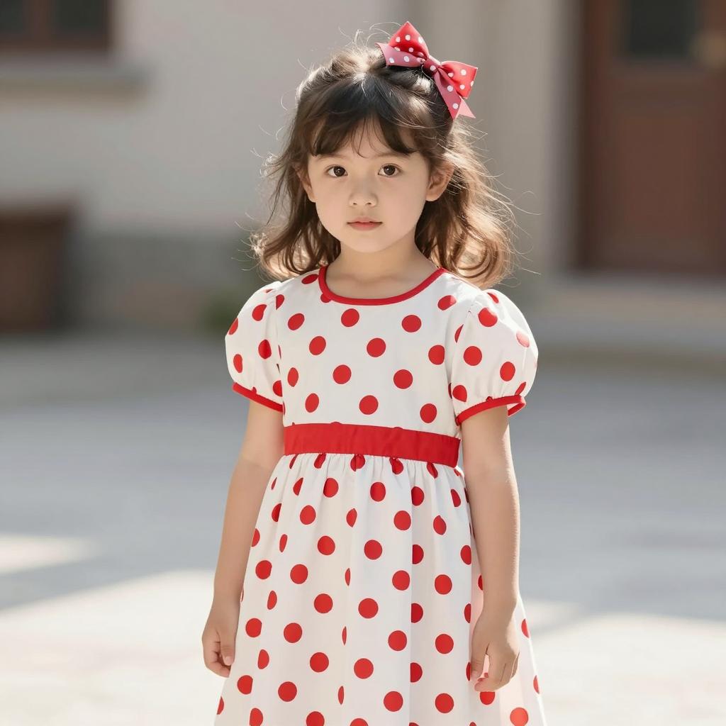 Two sweet birthday outfit, photograph of a young girl, cute, standing outdoors, daytime, wearing a pastel floral dress with puffed sleeves, pink and white crown with pom-poms, brown suspenders, smiling, sunlight, background of blurred buildings and trees, red door, warm colors, casual style, candid, summer vibe, soft lighting