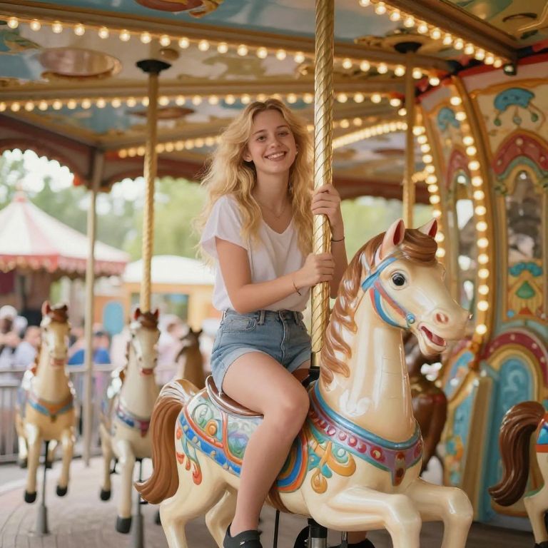 Blonde girl riding a wooden carousel horse in an old-fashioned amusement park, joyful expression, colorful lights and vintage decorations around, soft focus and whimsical mood, painterly style with warm tones.