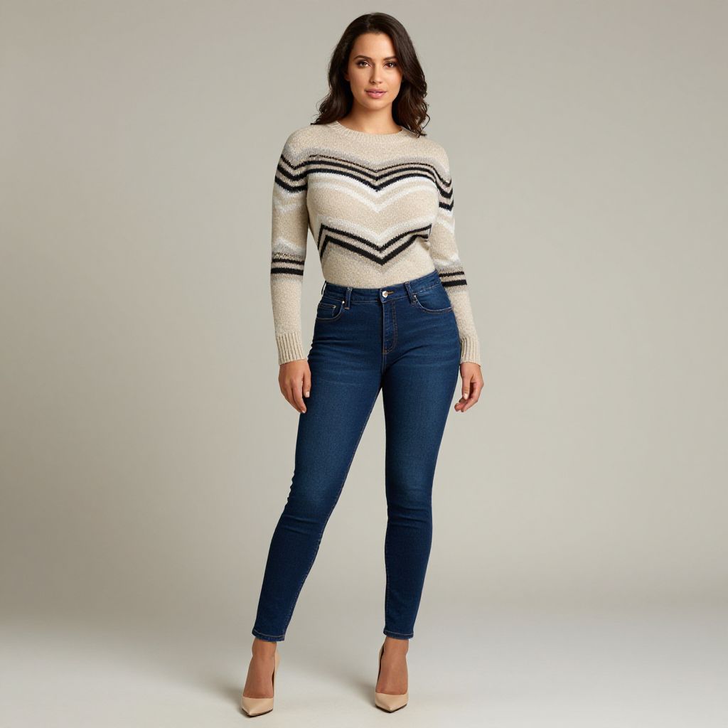 "Woman, casual contemporary, geometric patterned sweater in beige with black and white zigzag design, crew neck, long sleeves, fitted cobalt blue skinny jeans, beige pointed-toe high heels, studio background. Sexy. Pretty face and beаutiful eyes. Big breasts."