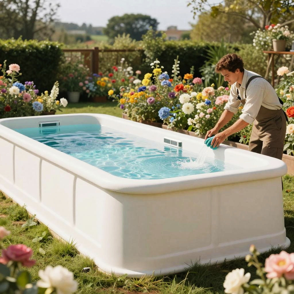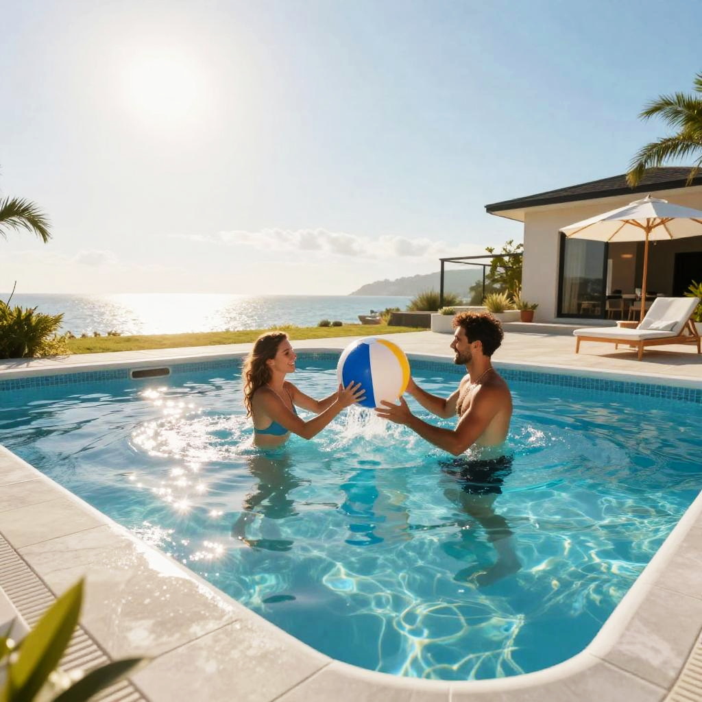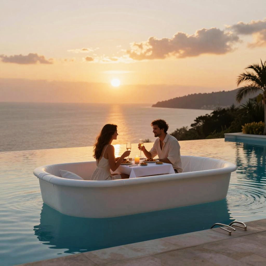 A photorealistic image of a couple having a candlelight dinner at sunset by an infinity edge fiberglass pool, advertising a fiberglass pool. Golden hour lighting, cinematic composition, ultra-detailed, 8K resolution, dreamy and elegant