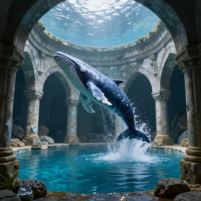 In a surreal dreamscape where ancient arches cradle a pool of crystalline water, a leaping whale defies gravity, symbolizing the boundless freedom of imagination amidst the enduring stillness of stone, evoking a profound sense of wonder and transcendence.