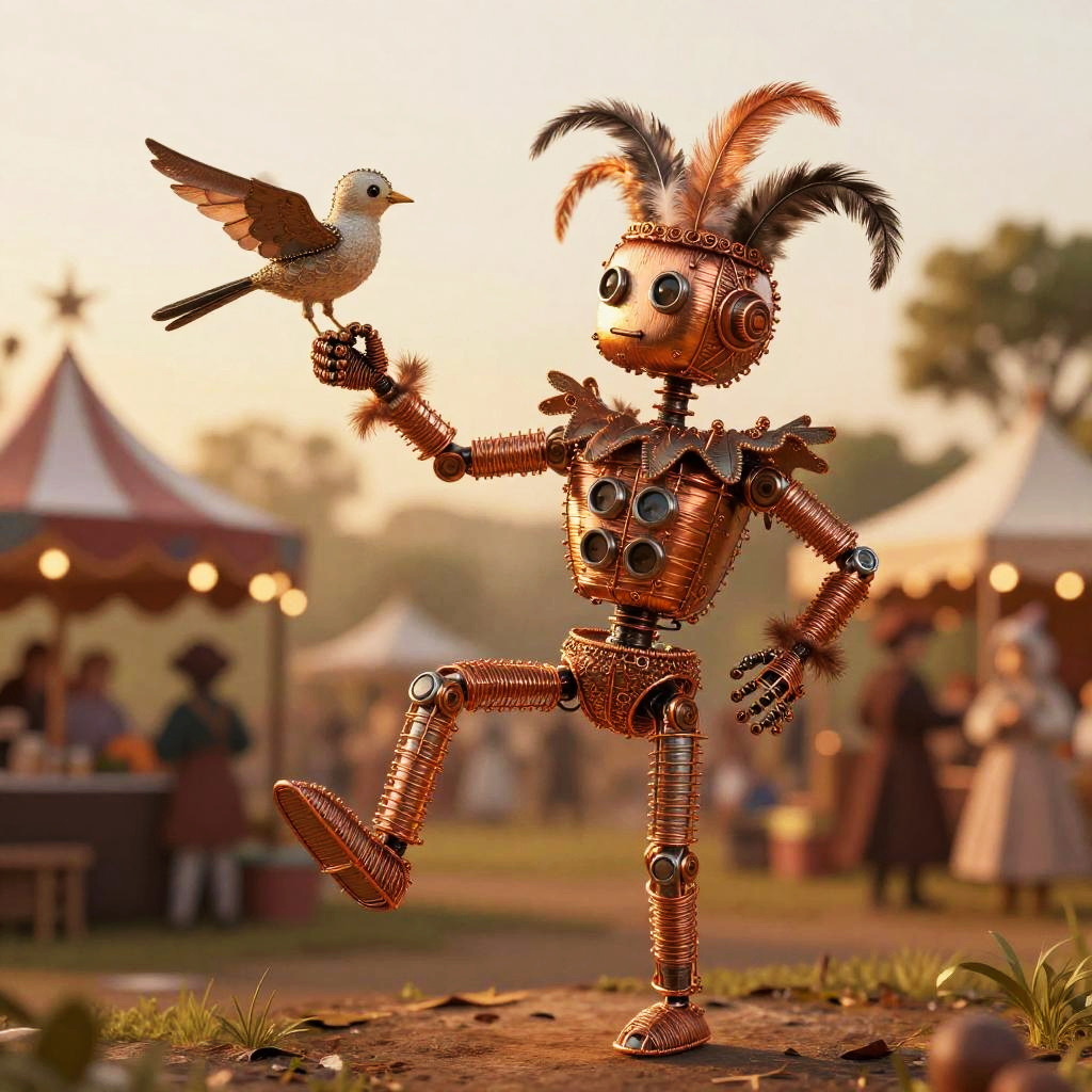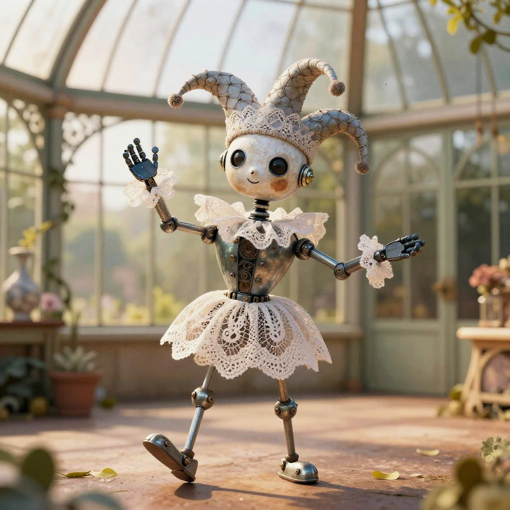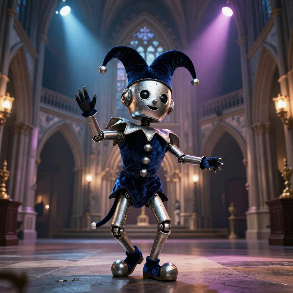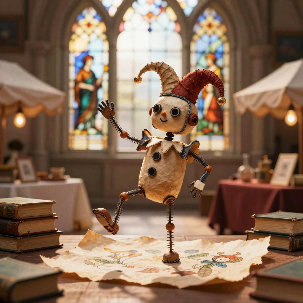 TCG Artwork. A whimsical robot jester crafted from hand-painted parchment and fine wire, performing in a old book fair, under a warm morning light filtering through stained glass.