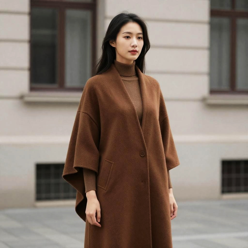 Ladies Knitted Cape, woman in a brown coat standing in front of a building