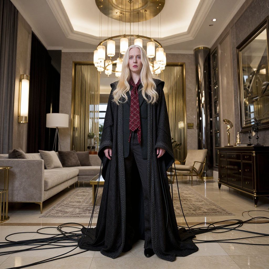 Photograph of a tall, blonde woman with long, wavy hair standing in an opulent, modern living room. She wears a long, black, textured robe with intricate patterns, over a dark red, patterned shirt and black pants. Black cords are spread out on the shiny, cream-colored tiled floor in front of her. The room features luxurious decor, including a large, white, floor lamp to the left, a beige sectional sofa with grey cushions, a dark wooden side table, and a large, circular, gold chandelier with multiple light bulbs hanging from the ceiling. Tall windows with gold curtains are in the background.