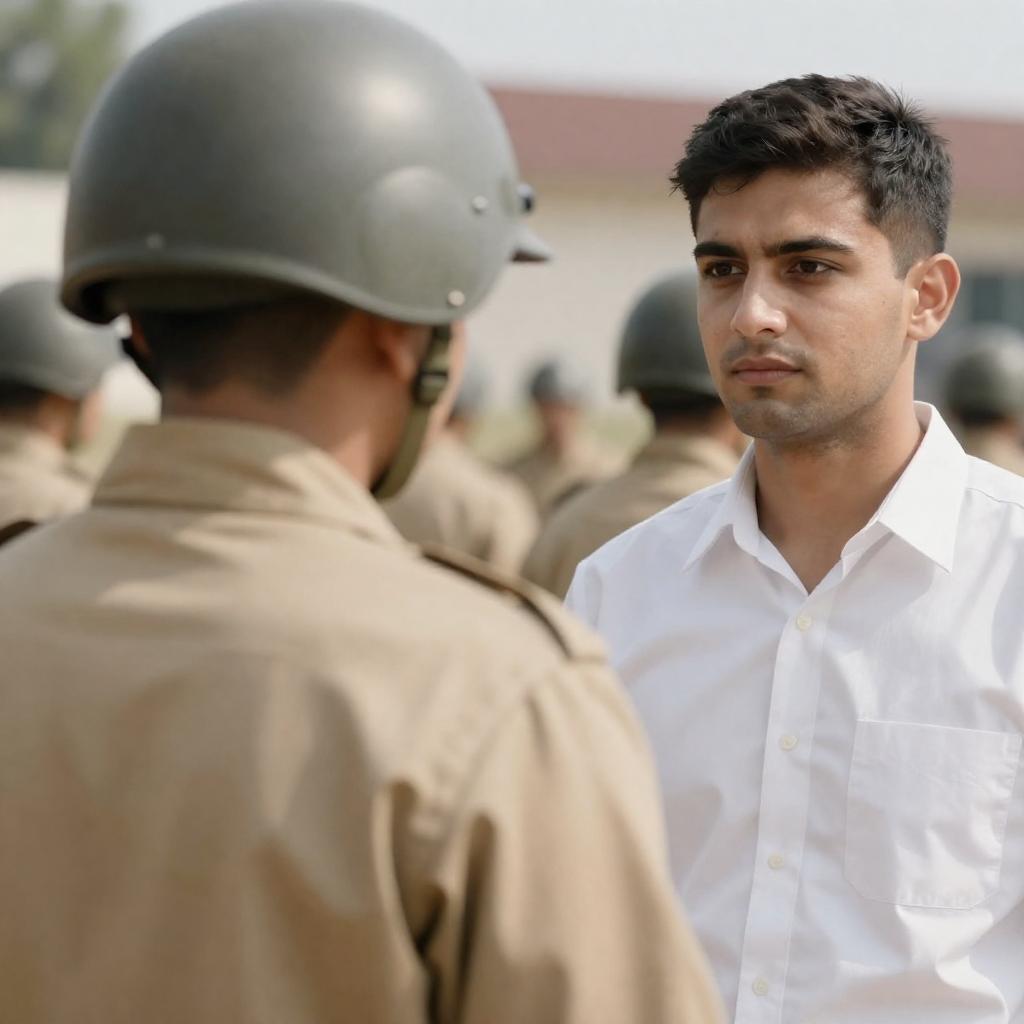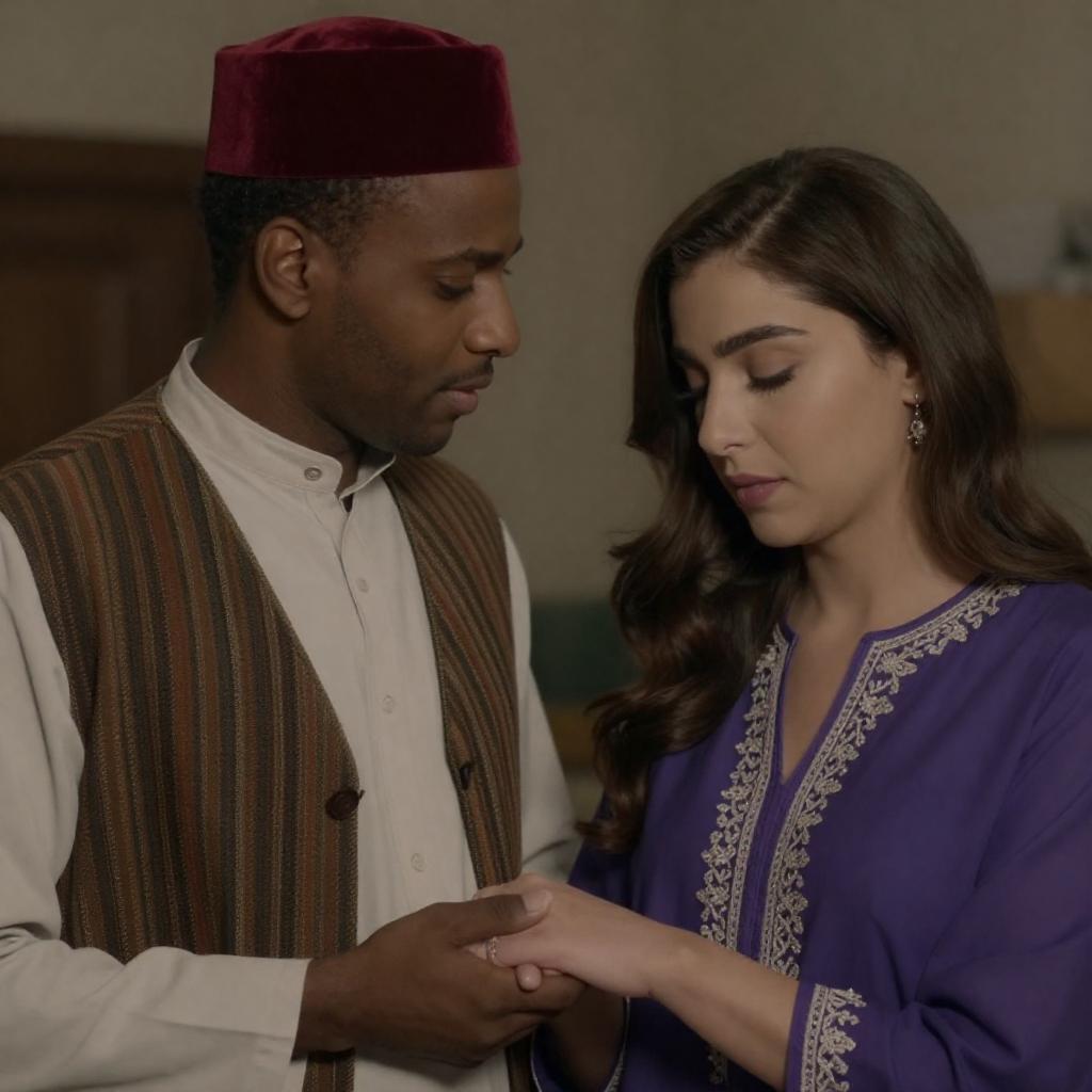 Photograph of a smiling middle-aged woman with a white headscarf and red-trimmed traditional dress, and a young man with short dark hair and a brown shirt, both holding hands and smiling at each other. Background is blurred.