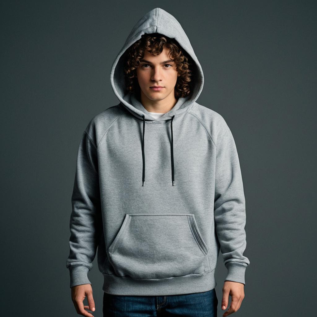 Man designer sweatsuit,1boy, solo, male focus, hands in pockets, facial hair, hood, grey background, realistic, pants, jacket, looking at viewer, white pants, white jacket, standing, simple background, brown hair, hoodie, beard