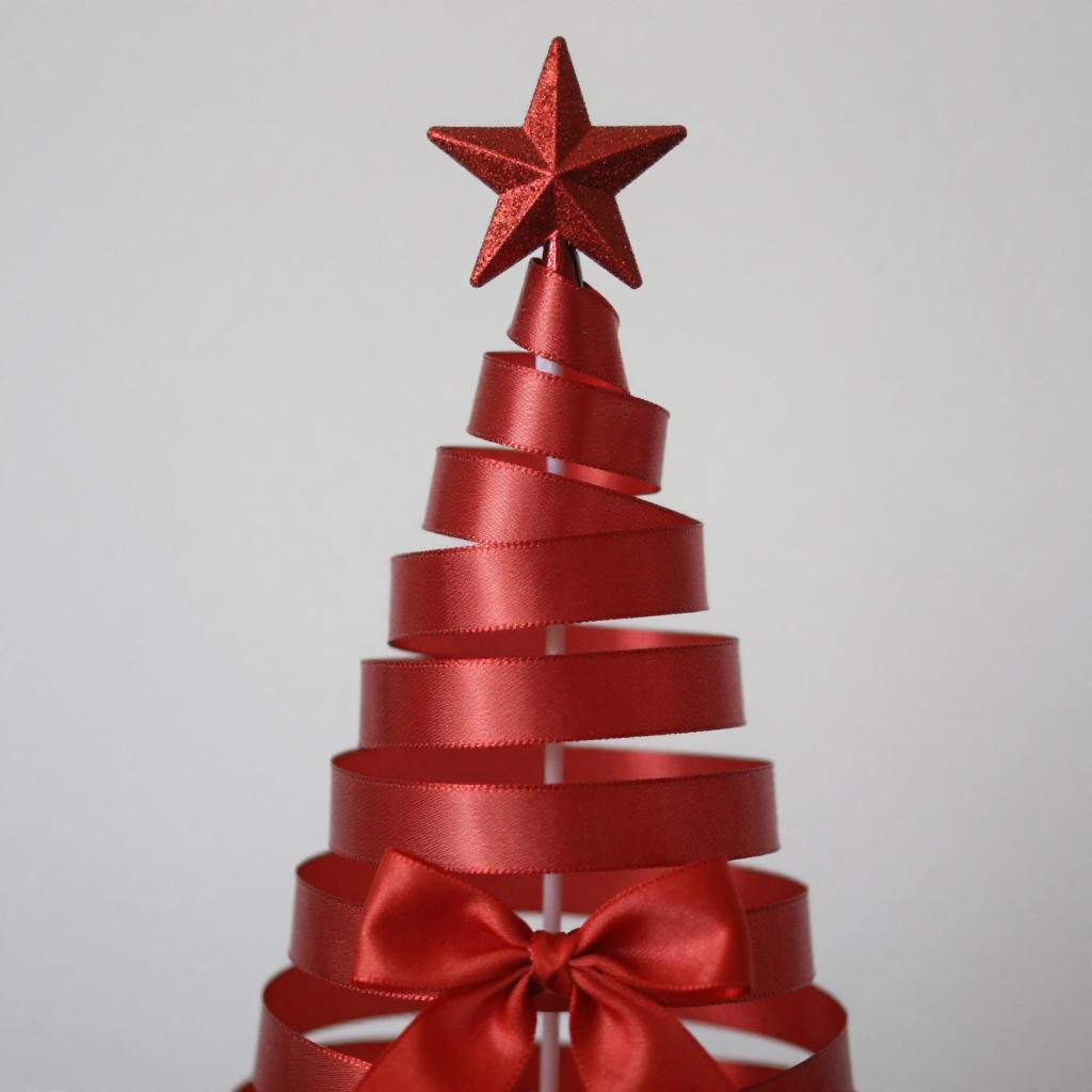 This is a close-up photograph of a red ribbon Christmas tree, shot from a slightly low angle. The tree is made of spiraled red ribbon, with a small red star on top. A red ribbon bow is tied at the bottom. The background is plain white and completely out of focus, highlighting the ribbon tree. The lighting is even and bright, with no shadows. The depth of field is shallow, focusing solely on the ribbon tree.