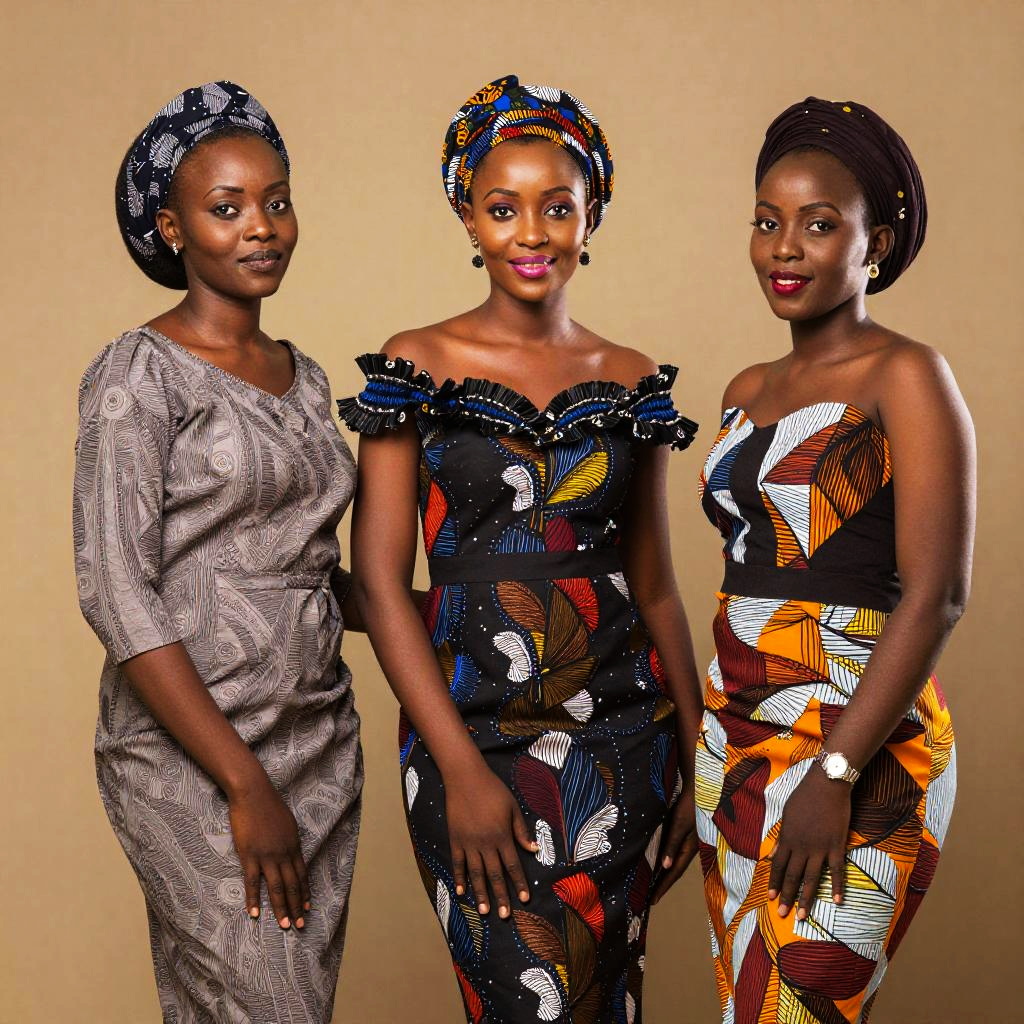 Photograph of two African women in vibrant traditional dresses, one in black and yellow pattern, one in blue with red belt, walking on a sunlit