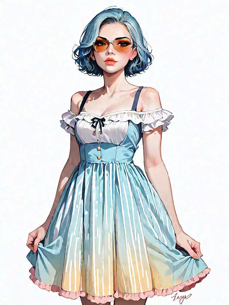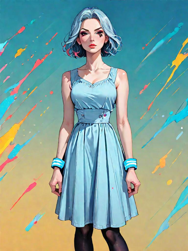 1girl, source_comics, realistic face, full body shot, Woman, cocktail party, A-line chiffon mini dress in pale yellow, thin spaghetti straps, straight neckline, adorned with green sequins and beadwork, layered sheer skirt, plain yellow underlay, natural makeup look, studio background with a slight vignette effect.