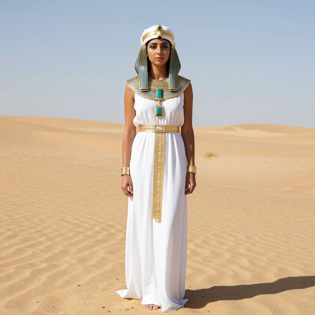 Photograph of a Black woman in ancient Egyptian attire, standing in a sunlit desert, wearing a white dress with gold accents, turquoise necklace, and