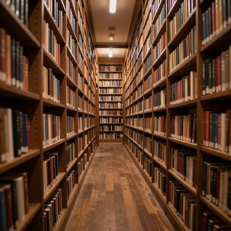 A timeless library corridor stretches endlessly into the horizon, its wooden shelves brimming with books that seem to pulse faintly with hidden worlds, inviting the curious to explore dimensions beyond the pages.