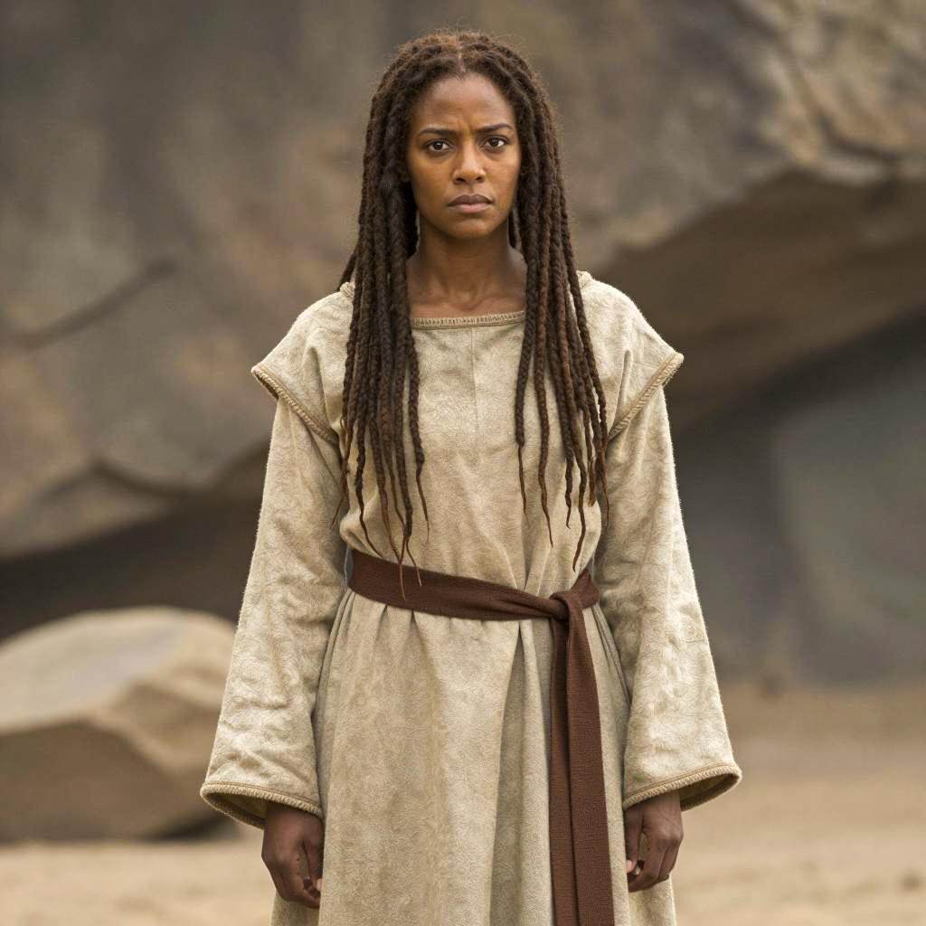 Carrie fisher slave costume, photograph of African woman, standing, front view, brown skin, long dreadlocks, serious expression, wearing beige and brown medieval-style dress with loose sleeves, brown belt, rocky background, daytime, natural light, realistic, detailed ures, earthy tones, rustic setting