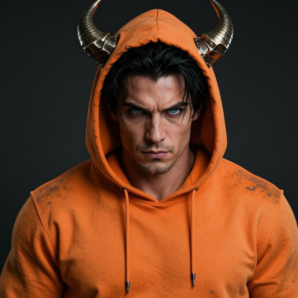 A man with black hair and blue eyes is wearing an orange hoodie with horns on his head. He has a muscular build, a confident demeanor, and a slightly rugged appearance. His eyes are intense and piercing, reflecting a sense of authority and mystery. The hoodie is faded, with visible signs of wear, and the horns are made of dark, metallic material, adding an edgy and supernatural element to his overall look.