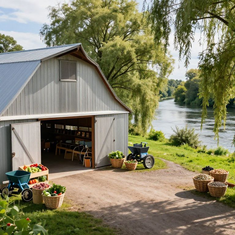 Wide angle view of a riverside feed and seed barn with open doors, farming equipment arranged neatly, baskets of fresh vegetables and seeds displayed at entrance, vibrant green riverbank with willow trees arching over the water, soft sunlight casting long shadows, inviting rural atmosphere.