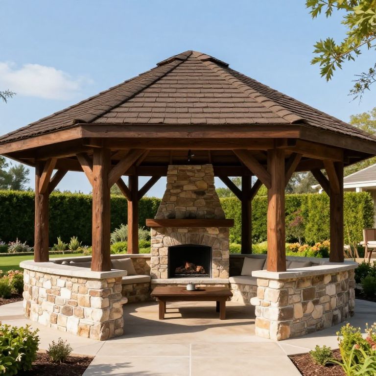 Outdoor gazebo featuring a rustic wooden frame with a brown shingled roof, surrounded by stone pillars and built-in seating, complemented by a central stone fireplace with a mantel, all set against a backdrop of manicured greenery and a clear blue sky.