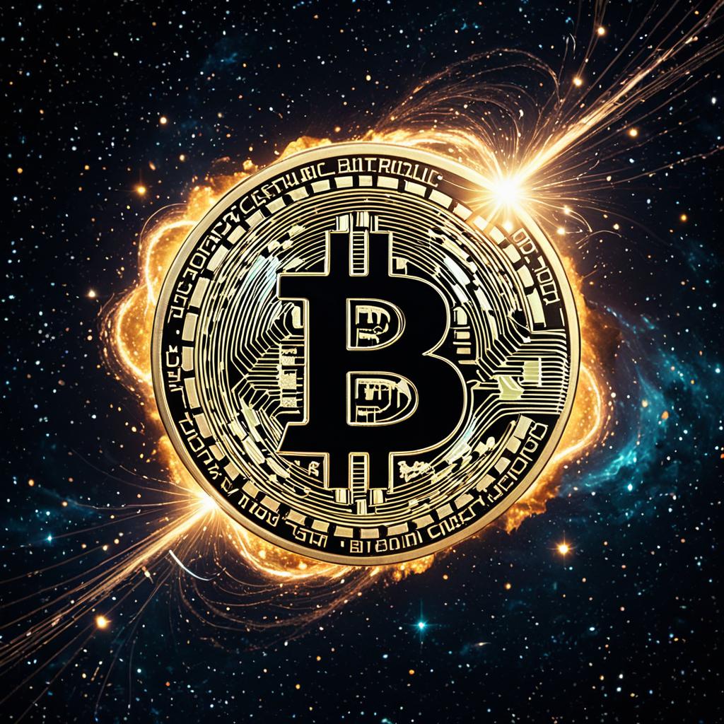Digital artwork of the Bitcoin logo portrayed as a cosmic entity surrounded by glittering nova explosions and wispy energy clouds, with a holographic star system rotating in the background. Set against a mystical galactic outskirts backdrop with glowing void and starry sky.