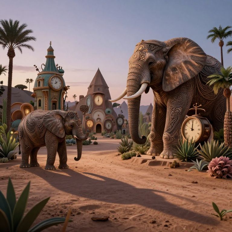 Craft an alluring surrealist landscape where timepiece-inspired structures harmonize with lush botanicals, creating an extraordinary amalgamation. In the foreground, an awe-inspiring elephant stands regally at the edge of a desert, its commanding silhouette intricately woven into the contours of the peculiar formations, extending a long, mystical shadow over the parched earth below. The scene should be bathed in a gentle twilight light, evoking feelings of intrigue and introspection while enveloping spectators in an air of mystery.
