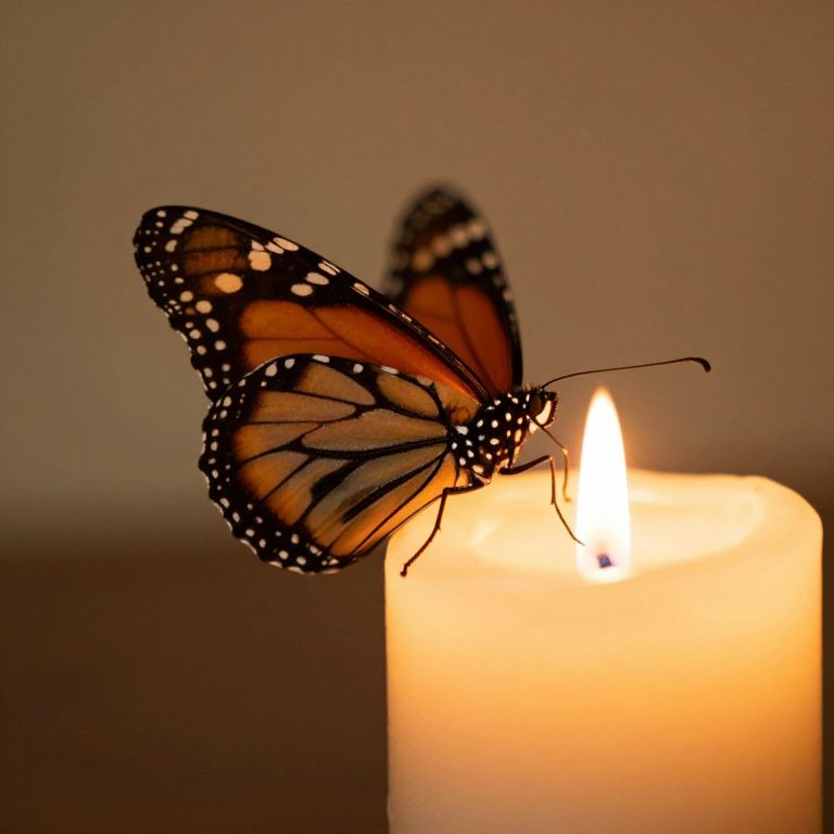 A delicate Monarch butterfly, bathed in the warm glow of a flickering candle flame, evokes a serene and ethereal ambiance, blending natural beauty with the soft, impressionistic lighting effects of golden hour photography.