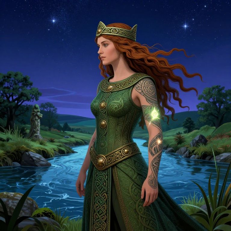 Celtic druid art illustrating a druidess with flowing hair, Celtic tattoos glowing faintly, standing by a river under a starry sky, vibrant natural elements, magical and serene mood