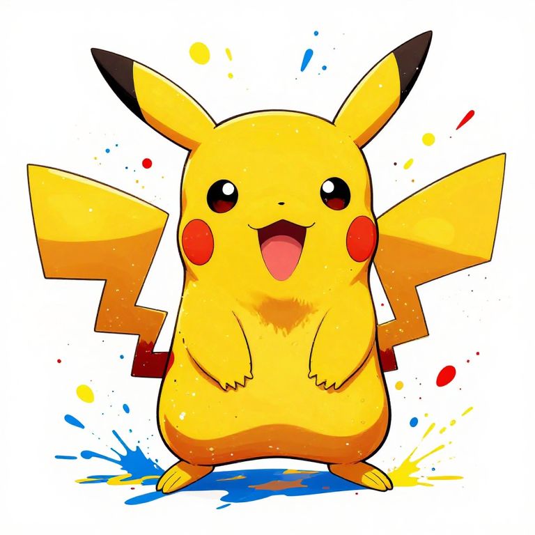 The image features a vibrant and dynamic depiction of Pikachu, a beloved character from the Pokémon series, rendered in a cartoon manga style reminiscent of Takashi Murakami's art. The Pikachu is depicted in a lively, energetic pose, with its mouth wide open in a joyful expression, revealing a bright red tongue. The character is adorned with colorful splashes and splatters of paint, predominantly in shades of yellow, red, and blue, creating a sense of movement and excitement. The background is a stark white, which contrasts sharply with the vivid colors of the Pikachu, making the character stand out prominently. The overall composition is balanced, with the Pikachu centrally positioned, surrounded by the colorful splatters that seem to burst outwards, giving the image a sense of energy and dynamism. The textures are varied, with smooth, glossy areas on the Pikachu's body contrasting with the rough, splattered paint effects, adding depth and visual interest to the scene.