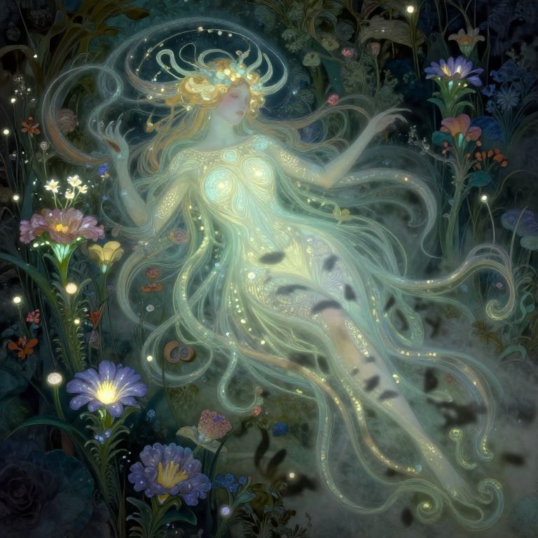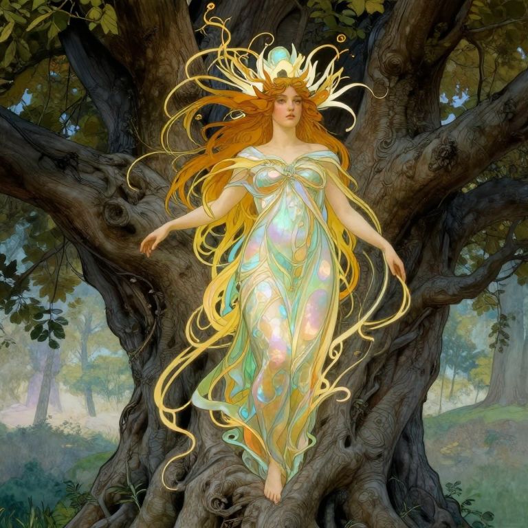 Imagine an exquisite digital artwork that merges the heavenly grace of a Pre-Raphaelite portrait with the magical charm of an otherworldly landscape. A tranquil nymph, her hair swirling like verdant vines, rests in a verdant garden where luminescent flowers bloom and gem-like crystals form the earth under her delicate bare feet. From an aerial viewpoint, her divine countenance is fully captured, surrounded by fantastical creatures such as serpentine beings with wings and phoenixes that frolic merrily around her, their brilliant plumage intertwining with tendrils of her flowing hair. This scene radiates a harmonious blend of enchantment and serenity, as the nymph's ethereal gaze seems to weave an invisible charm on all who behold this mesmerizing tableau.