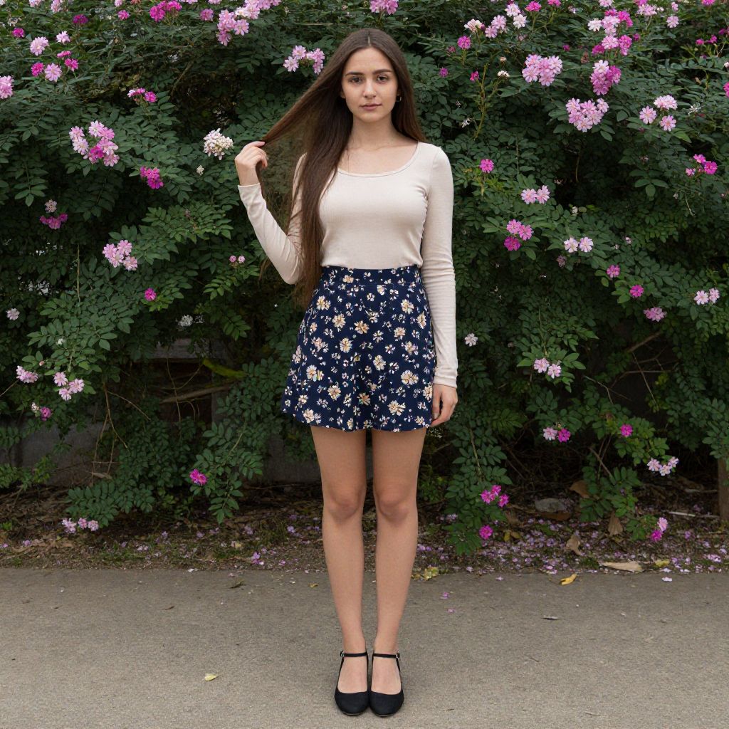 "costume woman fancy dress, 1girl, solo, skirt, brown hair, long sleeves, standing, long hair, full body, flower, realistic Realistic photo of casual sexy person with pretty face"