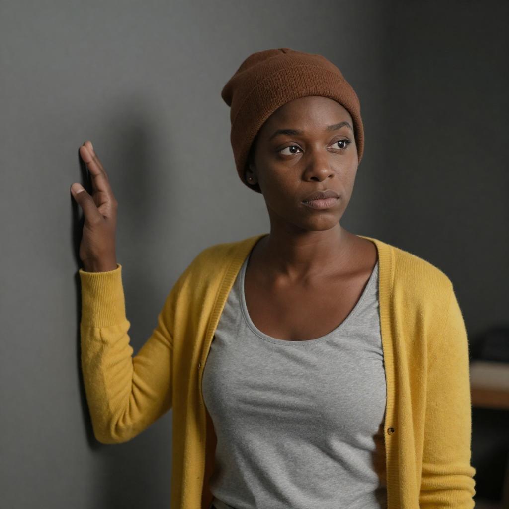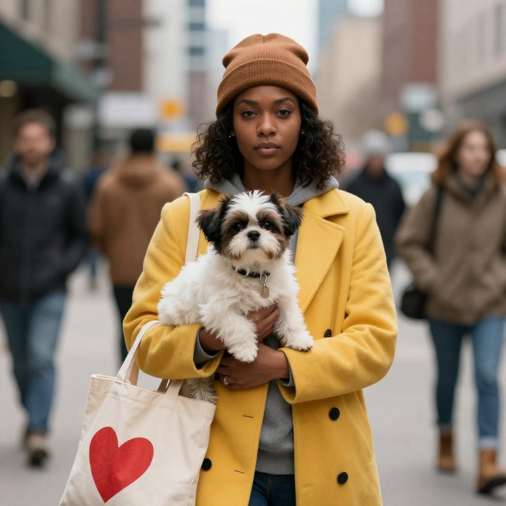 African-American woman with dark skin, brown beanie, yellow coat, holding small white and black dog, beige tote bag with red heart. Blurred urban background, multiple people walking, casual clothing, overcast lighting. Woman looks serious, dog looks alert.