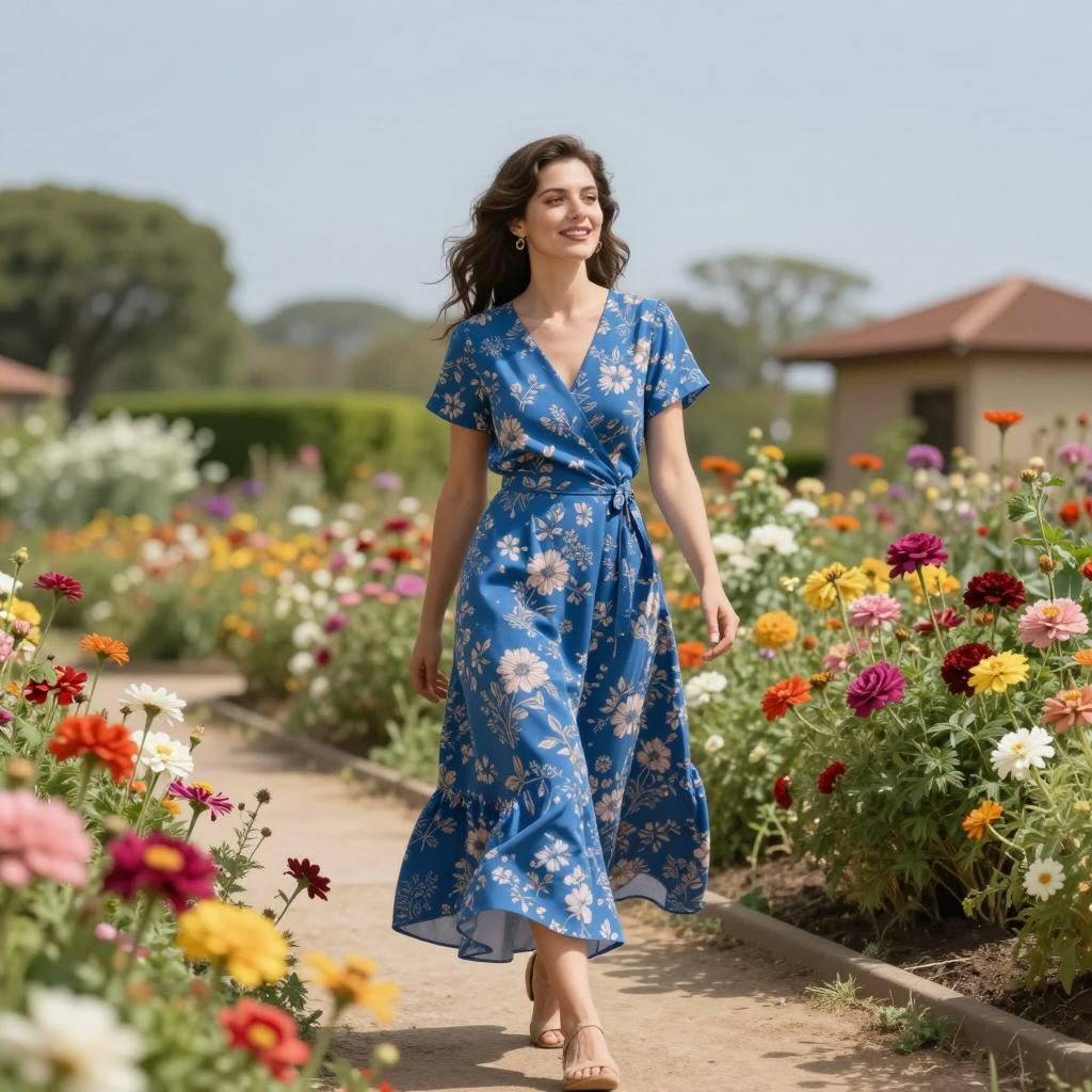 A woman walks gracefully through a vibrant flower garden, surrounded by colorful blooms under a bright, sunny sky. Dressed in a beautiful blue floral dress, she radiates joy and confidence as she enjoys the serene beauty of nature.