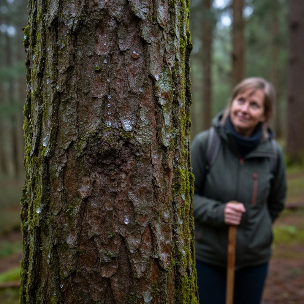 A detailed macro photograph of an evergreen tree’s bark with moss-covered patches and intricate patterns, taken in a damp forest clearing during afternoon rain, showing water droplets sliding down the trunk; the person is a middle-aged woman with a soft smile, holding a wooden walking stick, standing just behind the tree, observing the natural detail with reverence.
