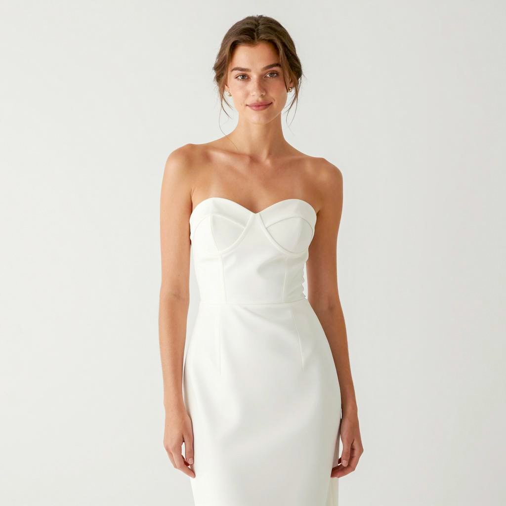 Photograph of a woman with blonde hair in a bun, facing away, wearing a backless white dress with a chain draped across her back. Her right arm is slightly bent, hands at waist level. Light gray background.