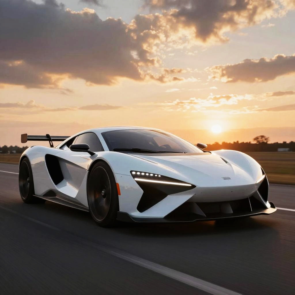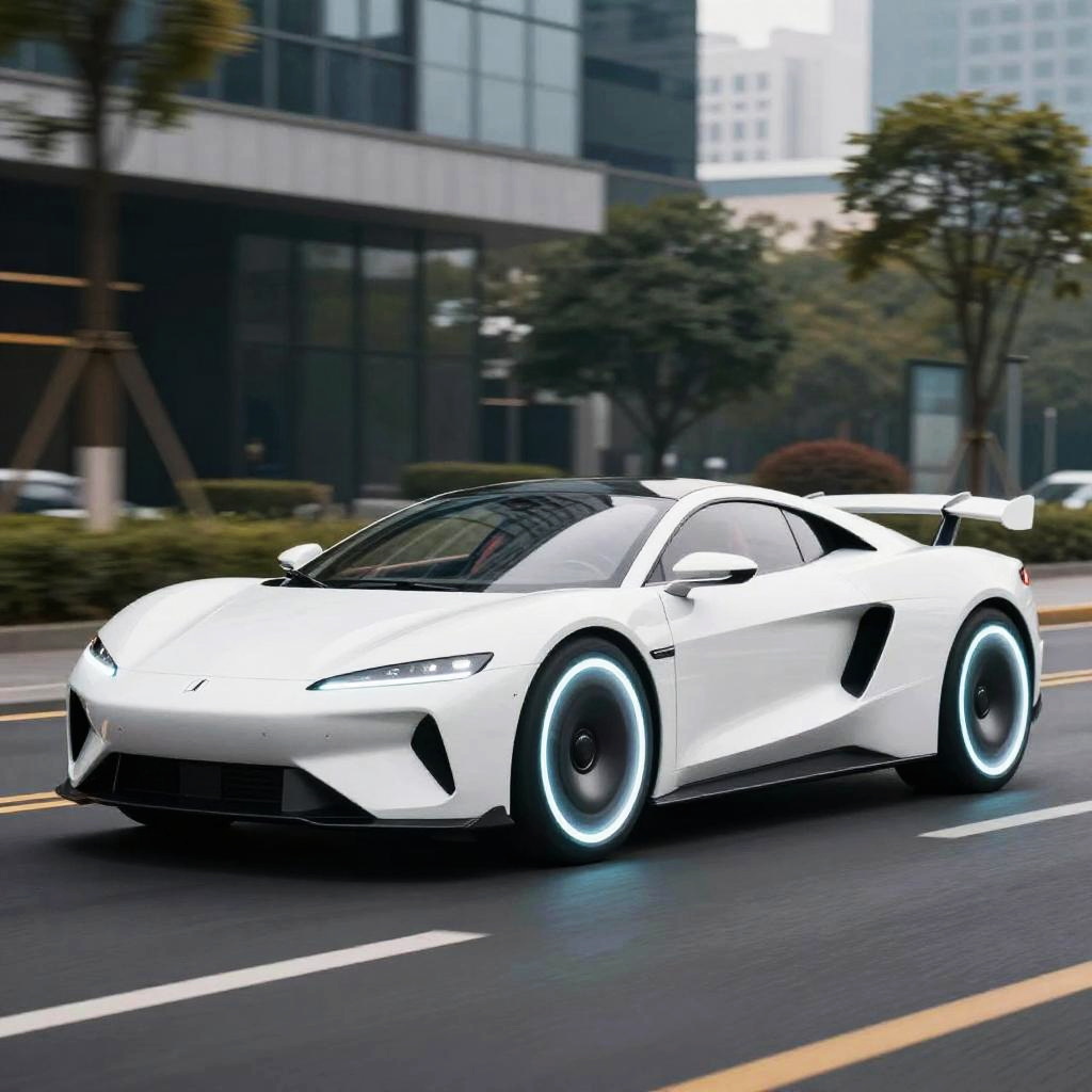 Photograph of a futuristic, sleek, metallic vehicle with a distinctive, ribbed, and curved design. The car is illuminated with bright white lights along its sides, creating a dramatic effect. It's parked on a textured, brown surface, in front of a modern building with a circular, golden ornament above the entrance. The background is dark, emphasizing the car's modern, high-tech appearance.