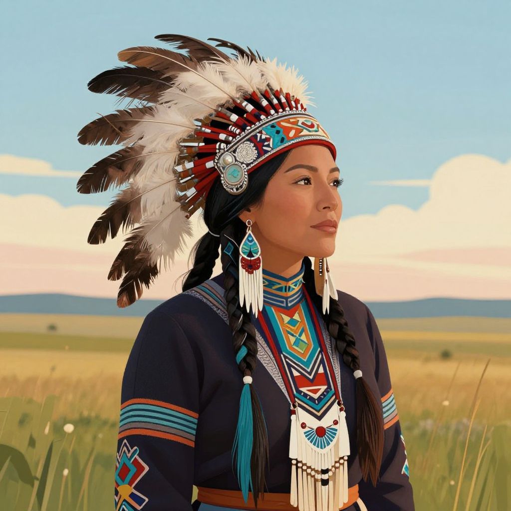 A vibrant digital illustration featuring a Native American woman adorned in traditional attire, including a feathered headdress and intricately patterned clothing, set against a serene prairie landscape with soft golden-hour lighting, evoking a sense of cultural heritage and natural beauty.