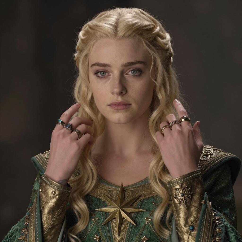 Costume arwen lord rings, photorealistic portrait of a young woman, blonde hair, wavy, long, wearing elaborate medieval-style green and gold garment, detailed embroidery, large star-shaped brooch, multiple ornate rings, serious expression, soft light, dark background, close-up, hands raised near face, subtle makeup, elegant, historical, fantasy vibe