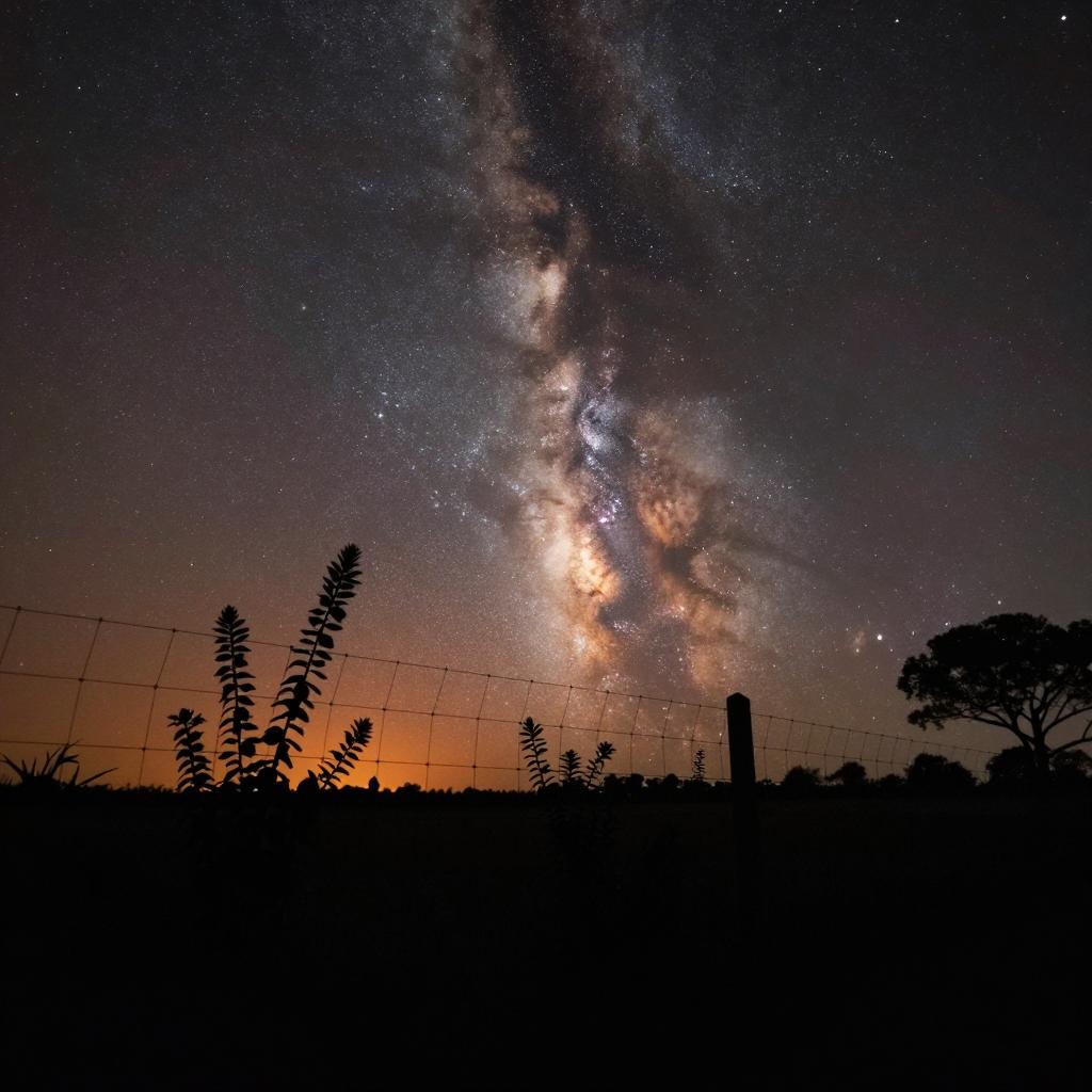 Night photograph. Wire fence in foreground with silhouetted plants. Starry sky with Milky Way visible. Orange and blue gradient in background. Dark horizon with tree silhouette on right. Numerous bright stars scattered across the sky.