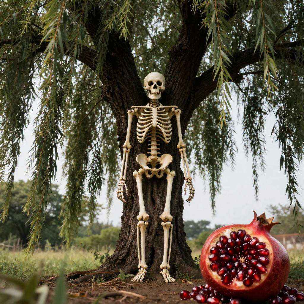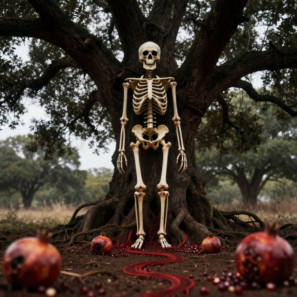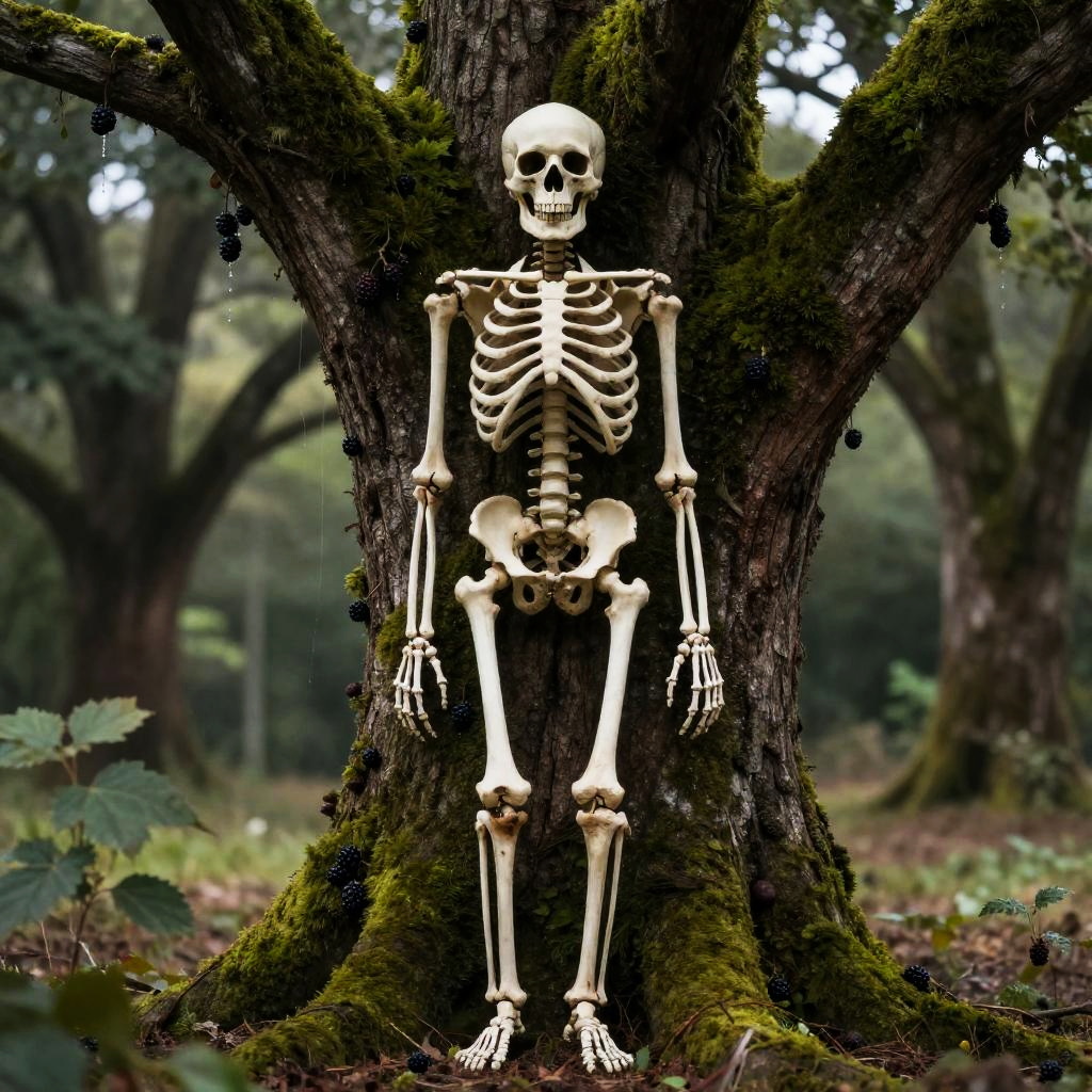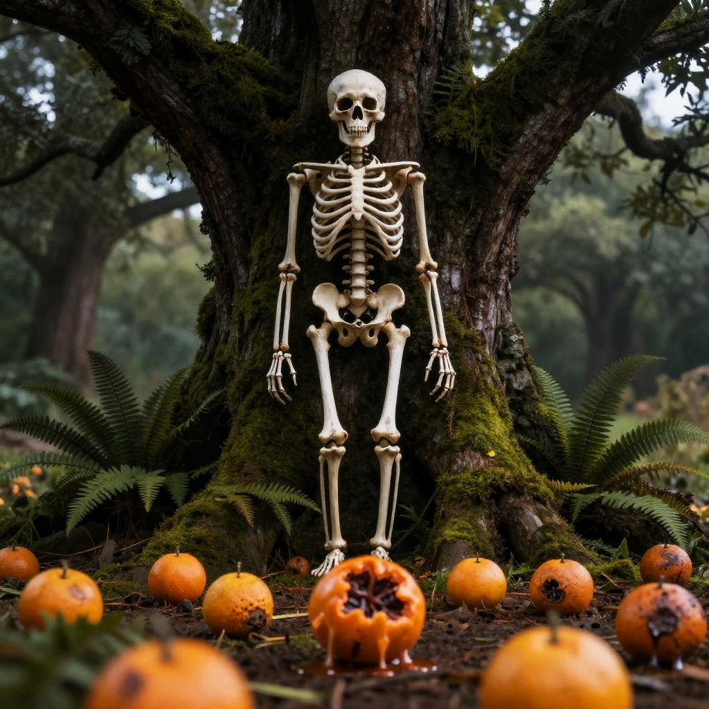 Skeleton by Mossy Tree with Rotting Clementines