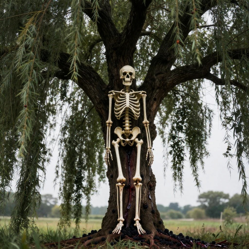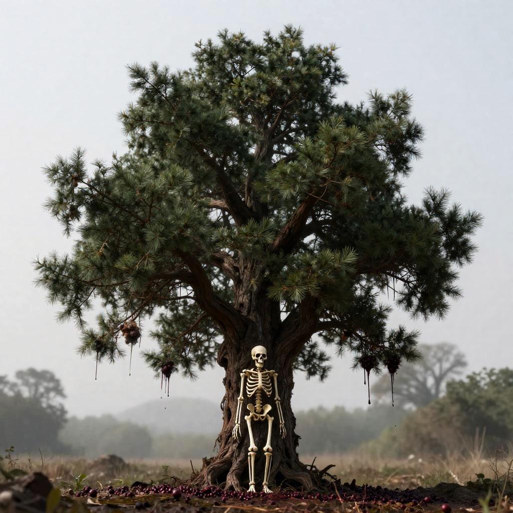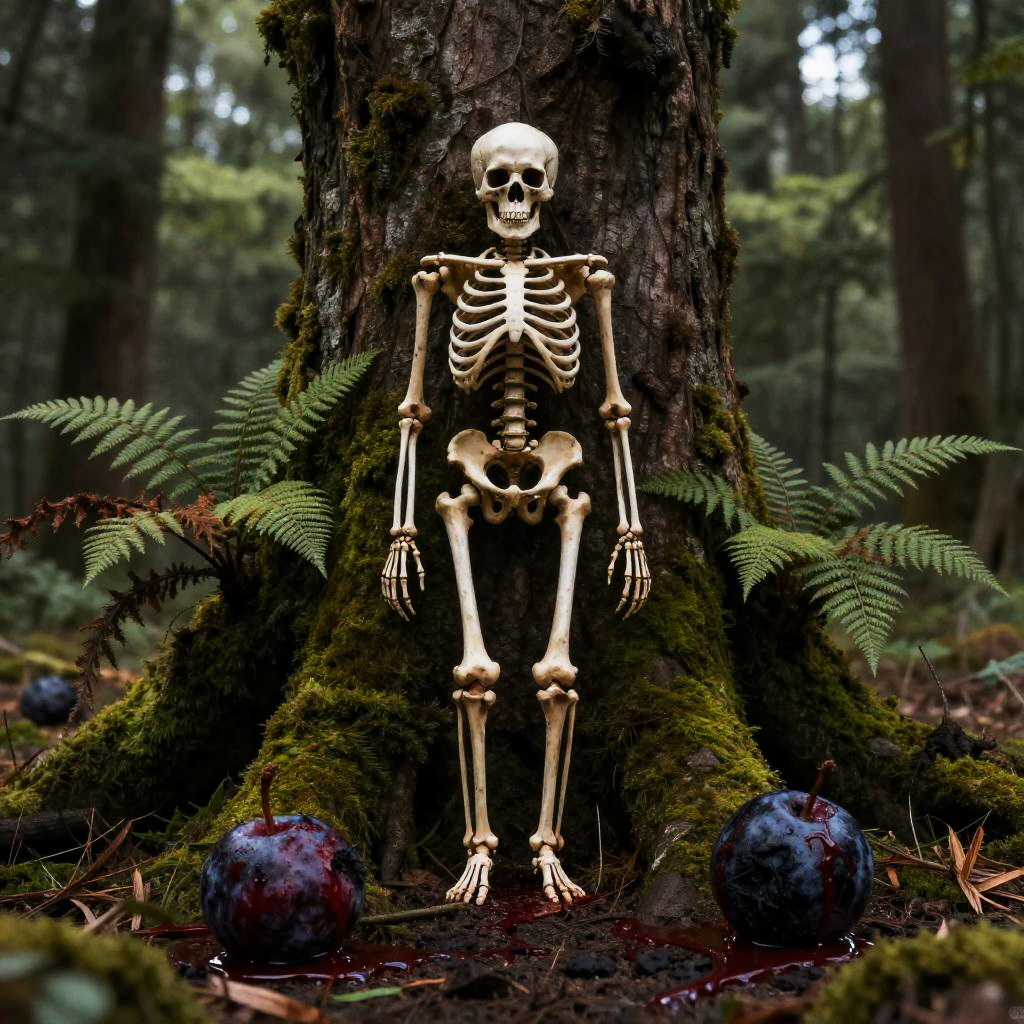 Wide shot, no humans, solo focus, horror theme, realistic style, detailed skeleton appearance, skull, towering tree, mossy_fern, rotting_clementine, dripping elements, eerie food, dripping_from_rotten_fruit, slightly blurry