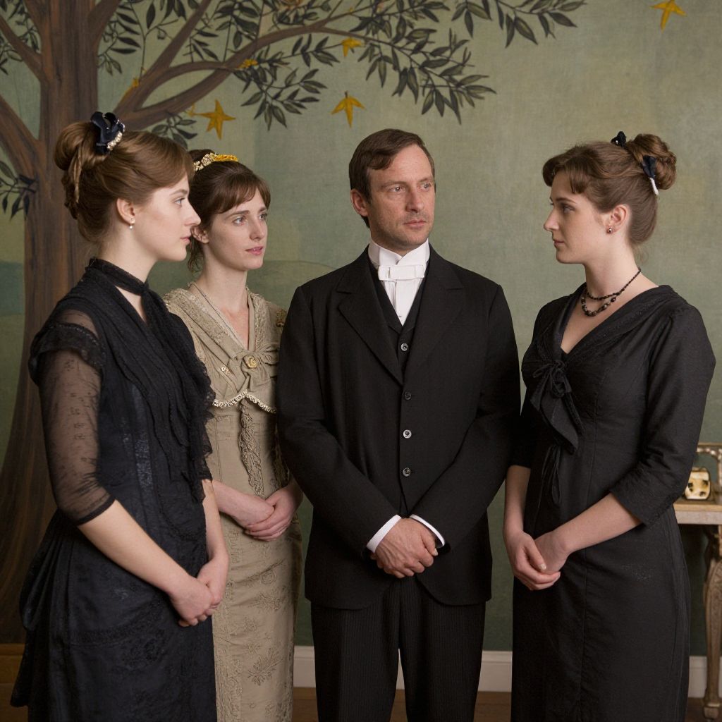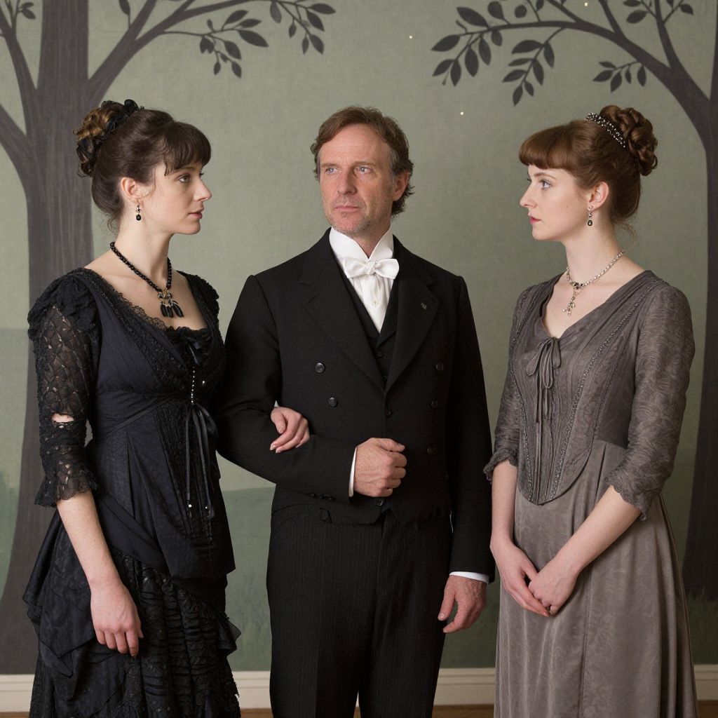 Elegant Victorian-era attire adorns three women and a man as they stand in a formal gathering, with the central figure in a black suit holding hands with two of the women, while the third woman gazes intently at the scene, set against a backdrop of stylized trees and a muted green wall.
