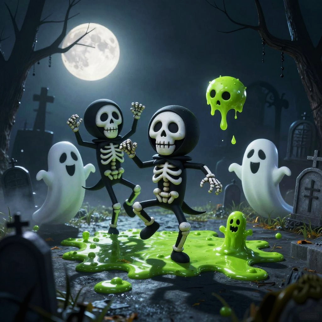 Spooky cartoon characters dancing in a foggy graveyard, skeletal and ghostly designs with playful smiles and exaggerated features, moonlight casting long shadows, skull motifs and dripping slime effects, vibrant use of dark blues and eerie greens for a fun Halloween scene