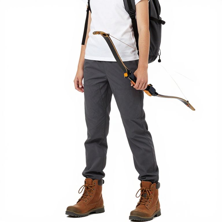 Photograph of a person from the waist down, standing against a plain white background. The individual wears a white t-shirt, dark navy blue pants, and brown lace-up hiking boots. A black backpack is slung over their shoulders, and a brown and black composite bow is held in their right hand, with an arrow nocked. The person's left arm hangs by their side, and their right arm is partially visible. The image is sharply focused with high contrast, highlighting the textures of the clothing and the bow.