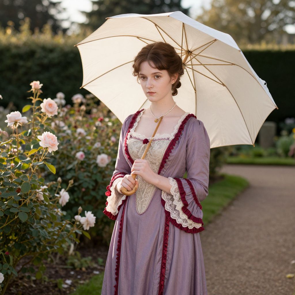 A detailed realistic photograph of a Victorian lady in her 30s with fair skin, delicate porcelain features, high cheekbones, and soft brown eyes, standing in a sunlit garden with delicate corset lace detailing visible on her elegant attire, holding a classic parasol with ivory silk fabric, dressed in a flowing lavender-colored dress with rich red trim, the setting is a historic English estate during a golden afternoon, with rose bushes and stone paths in the background, emphasizing timeless elegance and refined posture.