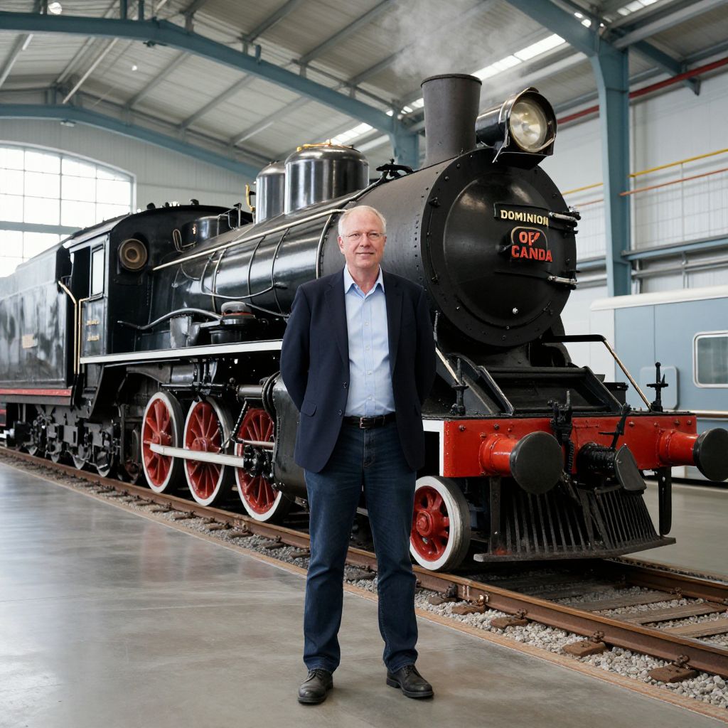 Andrew Goodman, managing director of Moveright International, stands confidently in front of the historic steam locomotive 'Dominion of Canada,' which is prominently displayed within the spacious interior of the National Railway Museum.