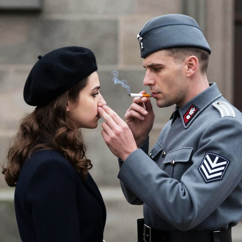 Photograph of a Nazi officer in a grey uniform and hat, holding a lit cigarette to a young woman's face with her hand over her nose. She has wavy brown hair, wears a black beret and dark top. Stone wall background. Officer's expression focused, woman's expression neutral. Officer's uniform has a swastika armband.