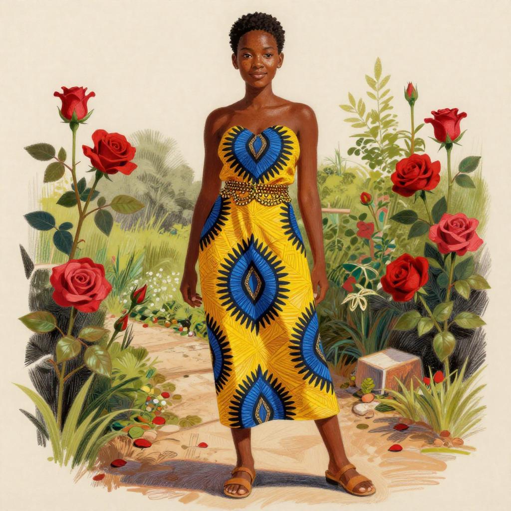 An artistic portrayal of a young Black woman in her mid-20s with short natural coiled hair, warm brown skin with a light smattering of freckles across her nose, confident serene smile and relaxed posture dressed in a flowing sun-yellow Ankara wrap dress with bold indigo geometric motifs, a brass beaded waist chain and tan leather sandals, standing on a rustic garden pathway surrounded by vibrant red roses, rendered in a vibrant contemporary gouache and colored-pencil illustration on textured paper, bold flat colors, delicate linework, warm midday lighting and subtle paper grain.